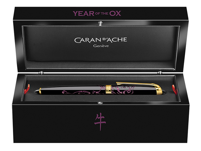 The “Year of the Ox” writing instruments are designed and produced as an artistic tribute. They embody the precious arts of figurative engraving and authentic Chinese lacquer, practiced for many years in the workshops of the Maison Caran d’Ache. The “Year of the Ox” edition is limited to 888 items in homage to Chinese culture, in which the number “888” is the ultimate sign of good luck. The Chinese symbol of wisdom and power is representing the purple Ox silhouette, emerging under the layer of black lacquer that adorns the instrument. The finely engraved design of the animal surrounds the body of the writing instrument, whose attributes are coated in yellow gold. The Ox’s resolute gaze shows its willingness to set itself up as a protector and its determination, an effect accentuated by its massive body and alert stance. |