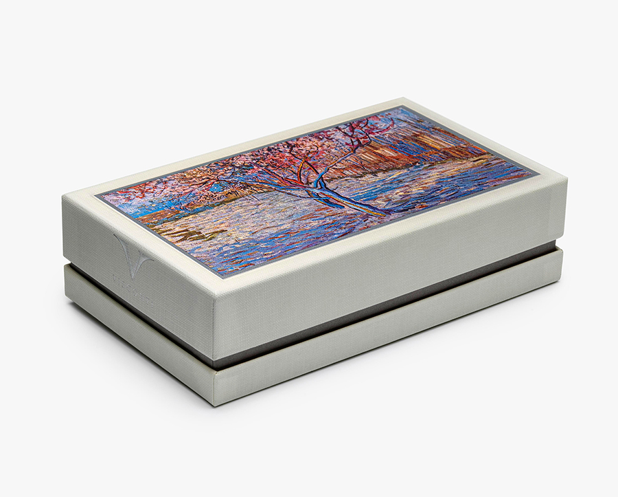 Visconti proudly introduces a new collection crafted from a new manufacturing process called "Press Mould". Developed by Visconti, this new process produces fantastic new colors obtained with natural resin and vegetal components. The color patterns vary from piece to piece, recalling the beautiful impressionist paintings of Van Gogh himself. Packaged in a lovely gift box, the Van Gogh will make quite an impression as a gift. The Visconti Van Gogh fountain pen features a Steel nib, available in fine, medium and broad, and a cartridge/converter filling system.