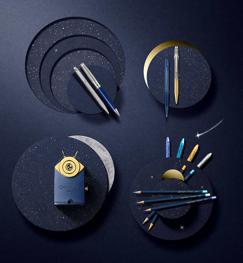 Caran d’Ache is celebrating the festive period with Cosmic Blue, a sparkling collection inviting you to dream as it whisks you off to the very heart of the cosmos. With its pearlescent celestial blue, the Léman pen captures the magic of shooting stars while the guillochage of the Ecridor calls to mind all the beauty of the planets. The 849 ballpoint pens continue this journey through space with their lunar reflections and their golden or night sky shades. |